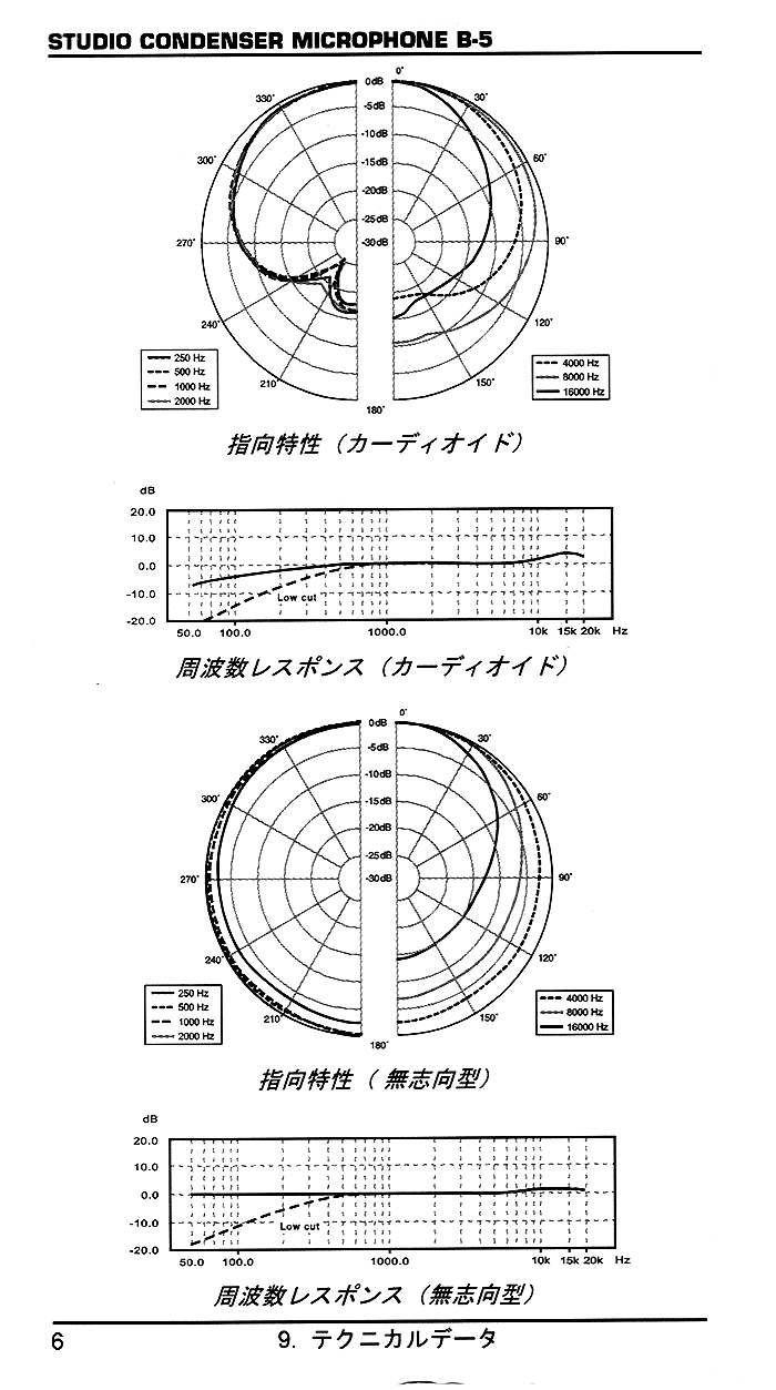 Behringer B5 コンデンサーマイクロフォン 単一指向性と無指向性カプセルが選択出来るコンデンサーマイクロフォンです。 カプセル径が18mmの小型マイクロフォンで、 ファンタム電源(DC48V)仕様のコンデンサーマイクロフォンです。 特性データです。 (取り扱い説明書より) 柔らかい音がしますが超低域の音は拾いません。 残念ながら位相特性はあまり良くないようです。